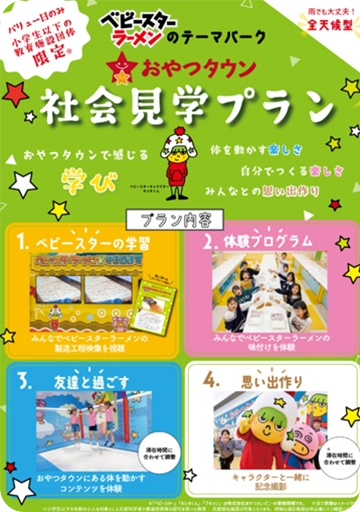 • おやつタウンの全部を楽しみたい! 10時:到着|10時50分~11時05分:フリフリ♪ベビースター体験|11時5分~12時:昼食|12時30分~13時10分:My スペシャルベビースター体験|13時15分~14時50分:自由時間|15時:出発