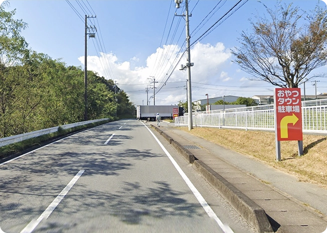 おやつタウンの建物を左手に見て、真っすぐ進むと「おやつカンパニー森工場」が見えてくるので、そこを曲がると「おやつタウン駐車場」があります。