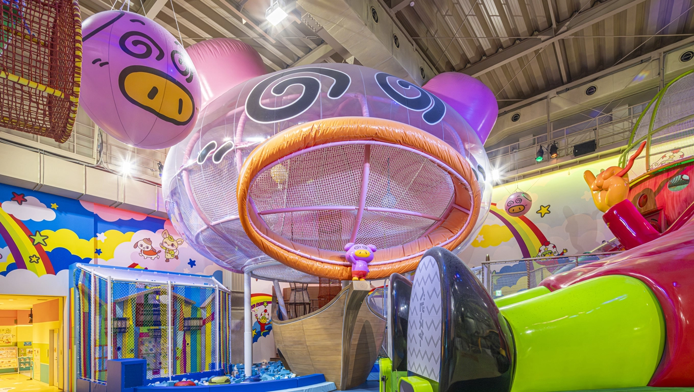 高さ9メートル、幅10メートル、船の形をした空間立体型アトラクション。 船の中には、ボールブランコやスライダー、ボルダリングなど、思いっきり身体を動かせる遊具がいっぱい! さらに、「ブタメンくん気球」はスケルトンになっているから、園内を一望できて、まるで空を飛んでいるかのような感覚を味わえるよ。さぁ、キミも、大航海の旅へ、心揺さぶるワクワクの冒険へ出かけよう!