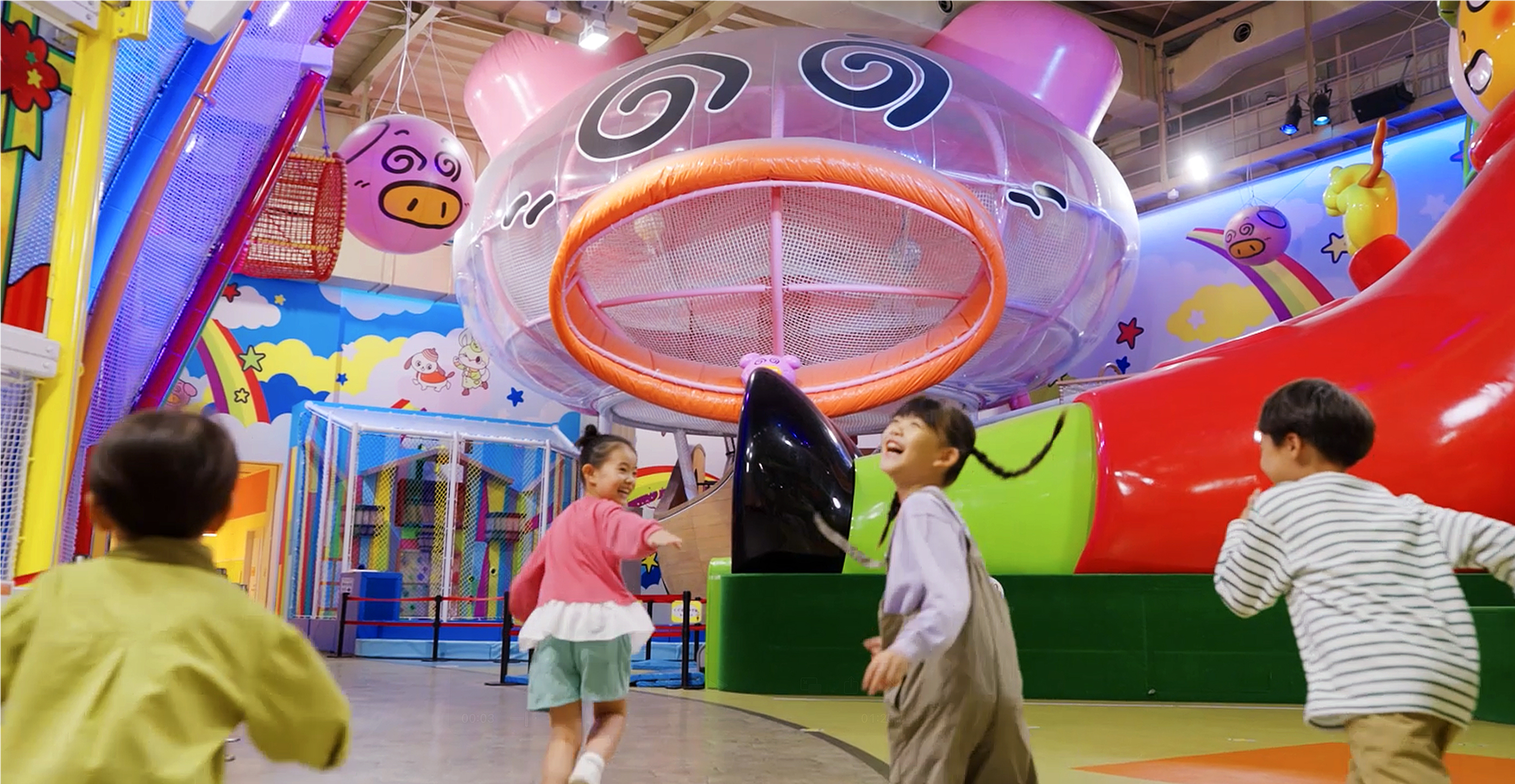「ホシオくんドデカイスライダー」「超ドデカイ ブタメンくんアドベンチャー」など、おやつタウンのアトラクションで、子どもたちは夢中で走り回り、親御さんも一緒に体を動かしてリフレッシュ!