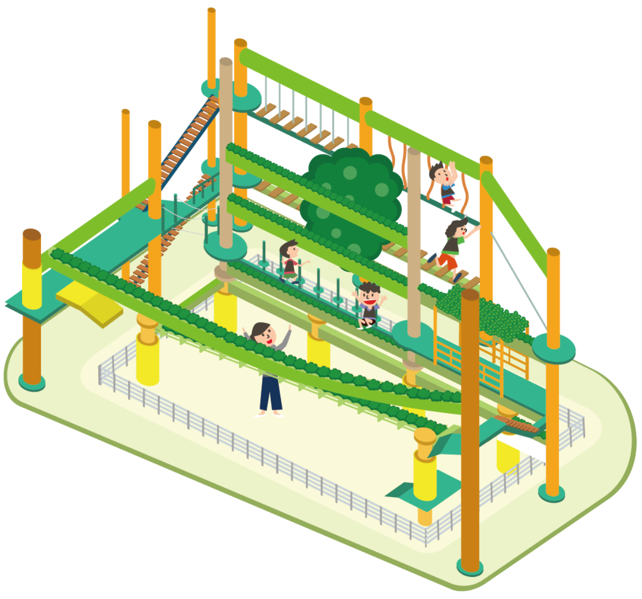 高さ9m、5層建てのネット型ジャングルジムは、まさに圧巻の大きさ! 登って、降りて、全身を使って、思いっきり遊べるよ。頂上までのルートは何通りもあるから、自分だけのルートで頂上を目指してね!