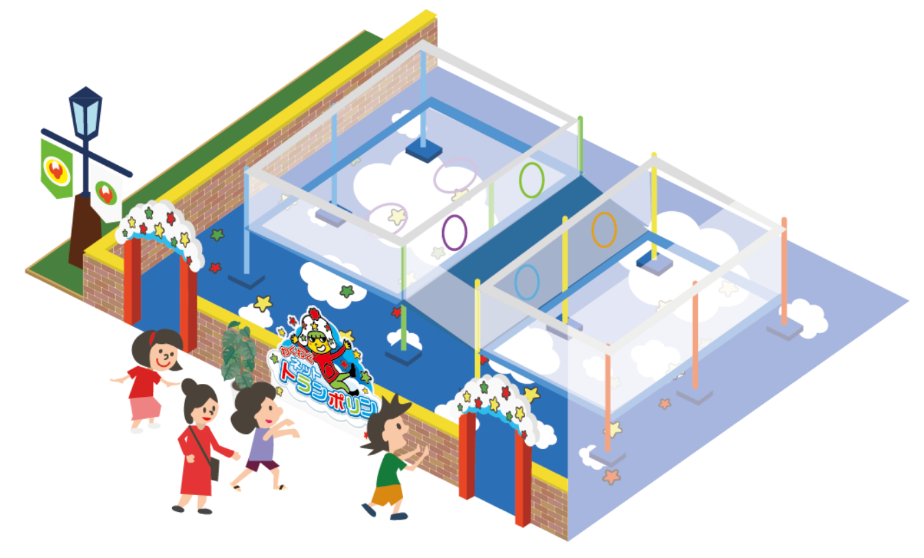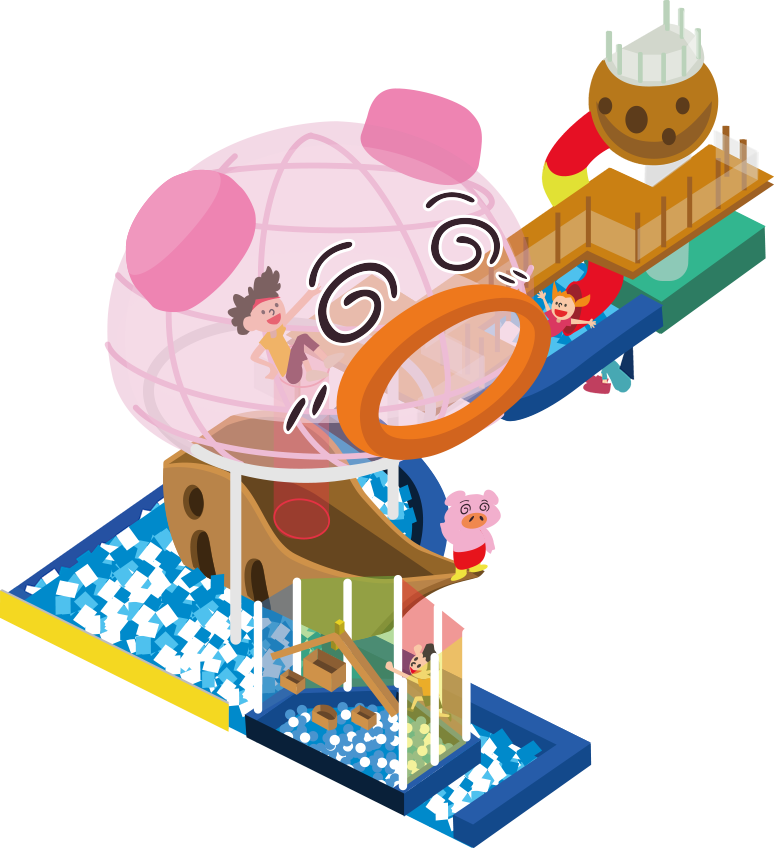 高さ9メートル、幅10メートル、船の形をした空間立体型アトラクション。 船の中には、ボールブランコやスライダー、ボルダリングなど、思いっきり身体を動かせる遊具がいっぱい! さらに、「ブタメンくん気球」はスケルトンになっているから、園内を一望できて、まるで空を飛んでいるかのような感覚を味わえるよ。さぁ、キミも、大航海の旅へ、心揺さぶるワクワクの冒険へ出かけよう!