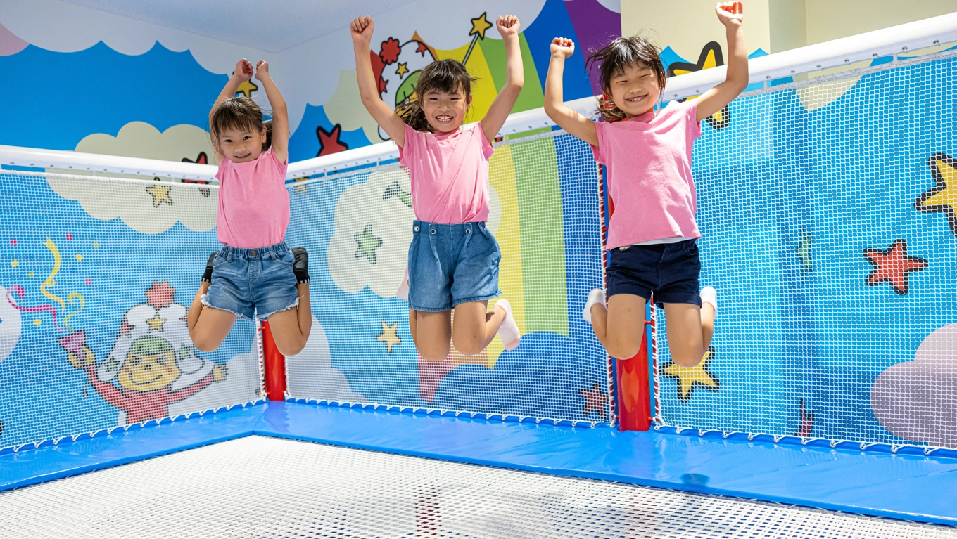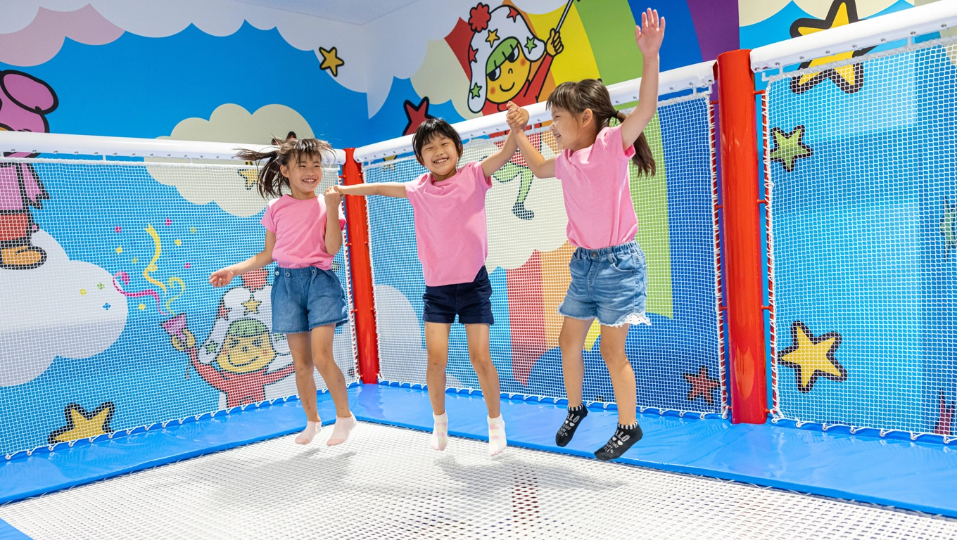 ネットトランポリンで、ぴょんぴょんジャンプ!ふわふわ揺れる感覚に、笑い声が止まらない! とんだり、はねたり、くぐったり、全力で楽しもう!