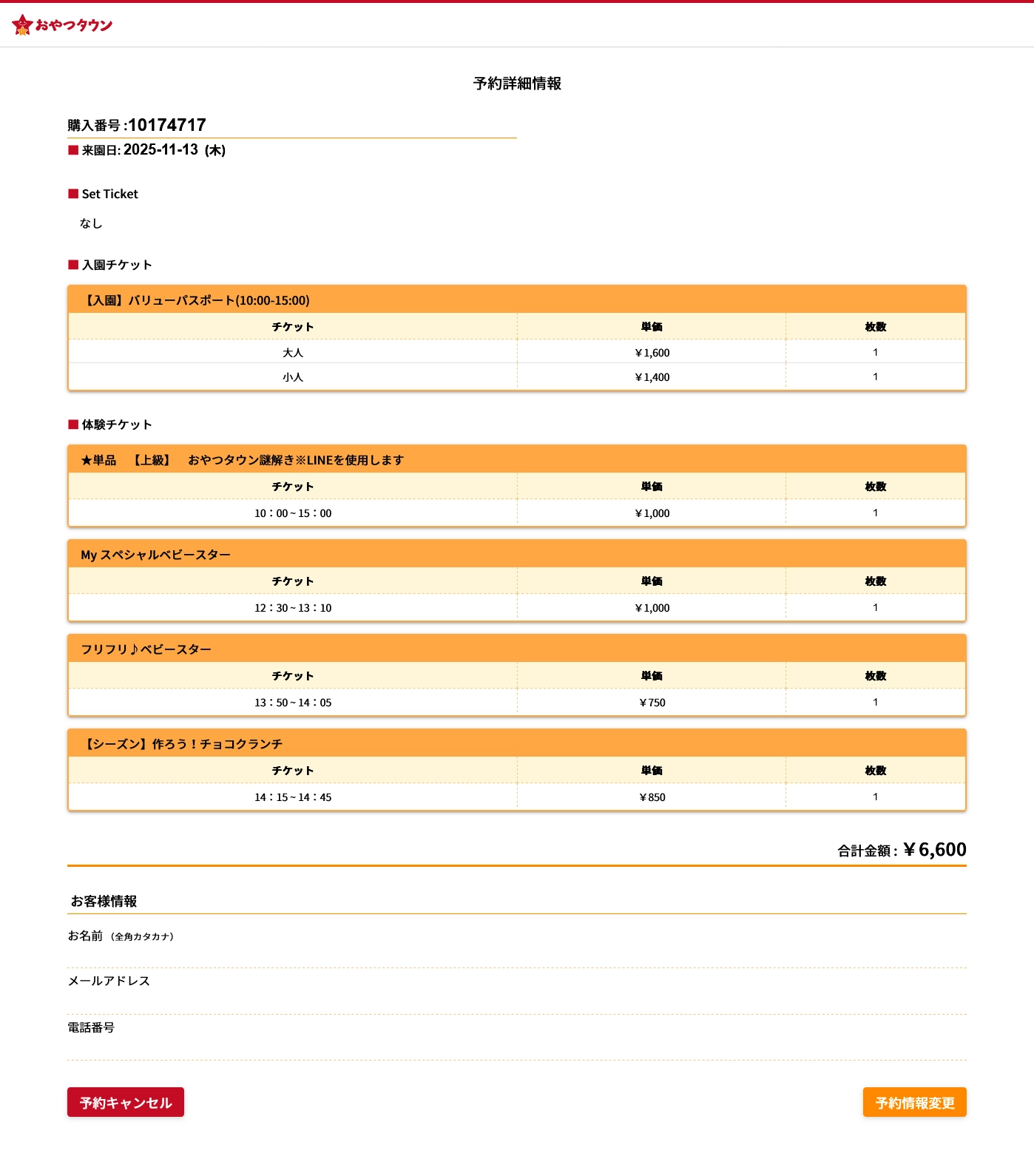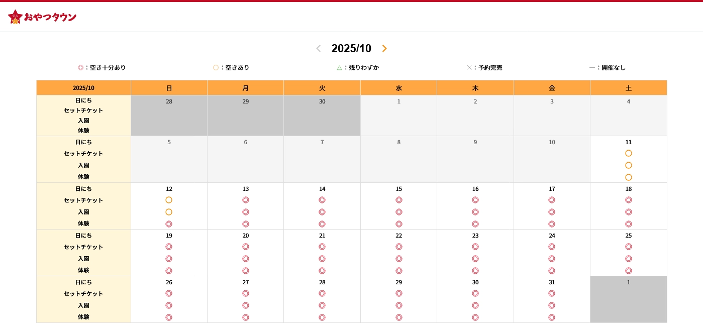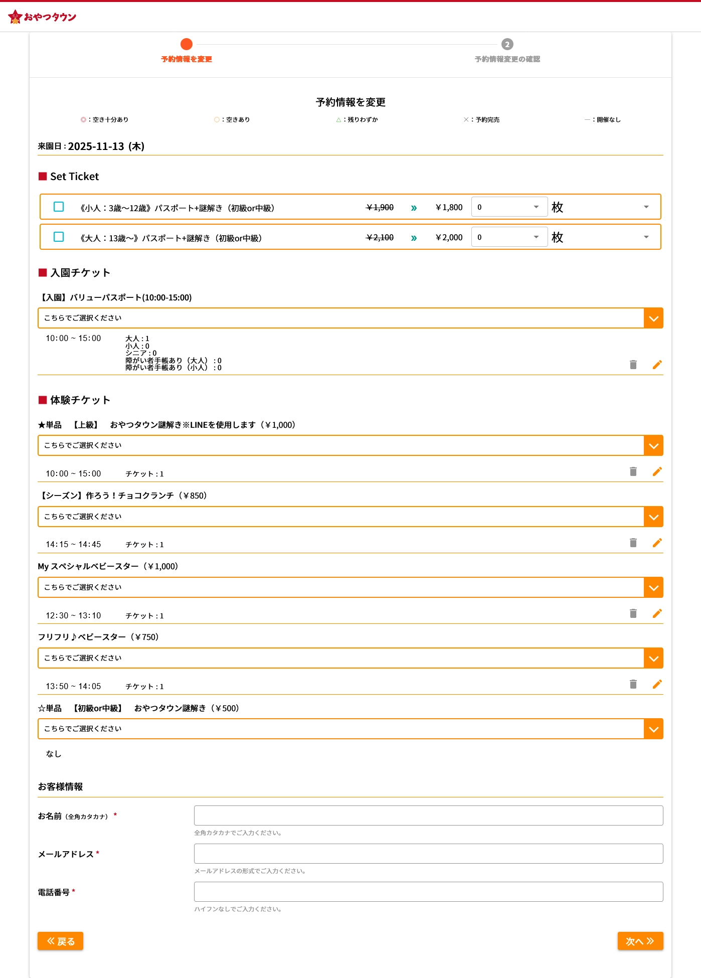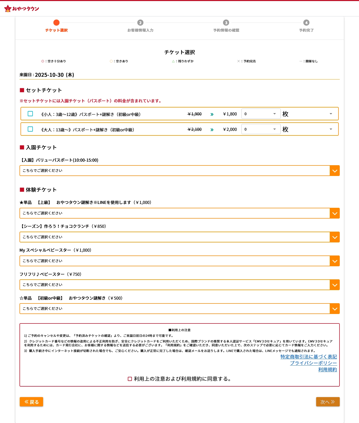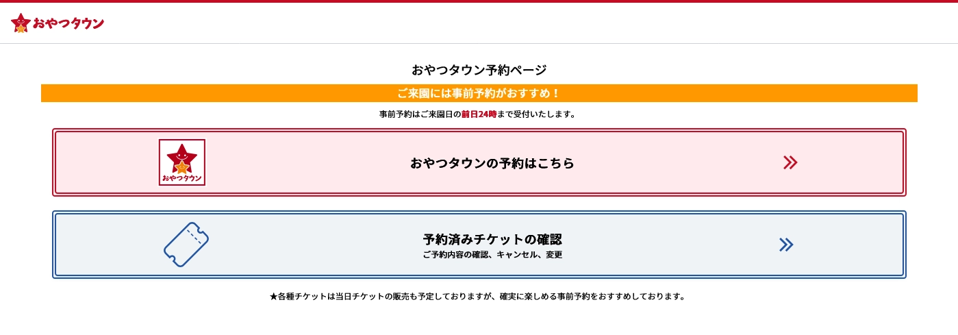 「おやつタウンの予約はこちら」を選択してください。事前予約はご来園日の前日24時まで受け付けいたします。