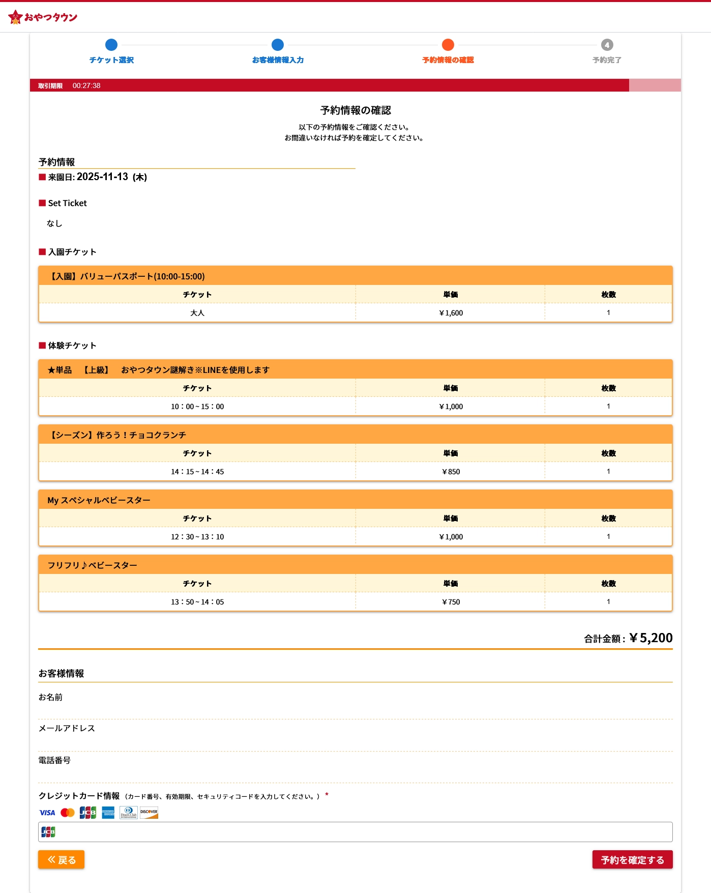 来園日、チケット内容にお間違いがないかを確認いただき、クレジットカード情報(カード番号、有効期限、セキュリティコード)を入力してください。