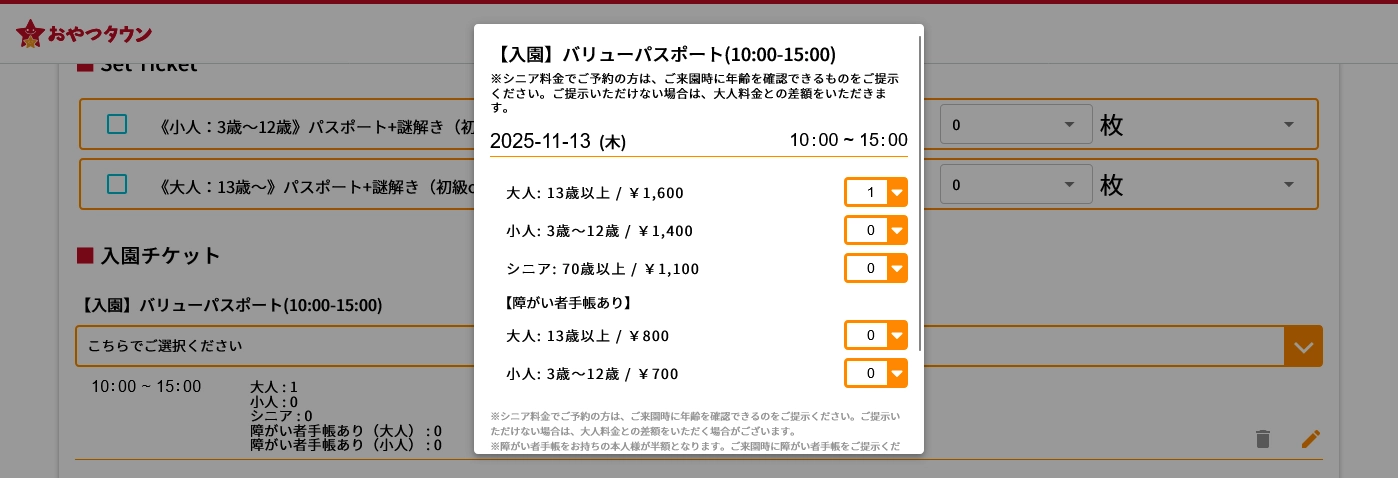 チケットのご利用枚数を選択いただき、決定を推してください。
